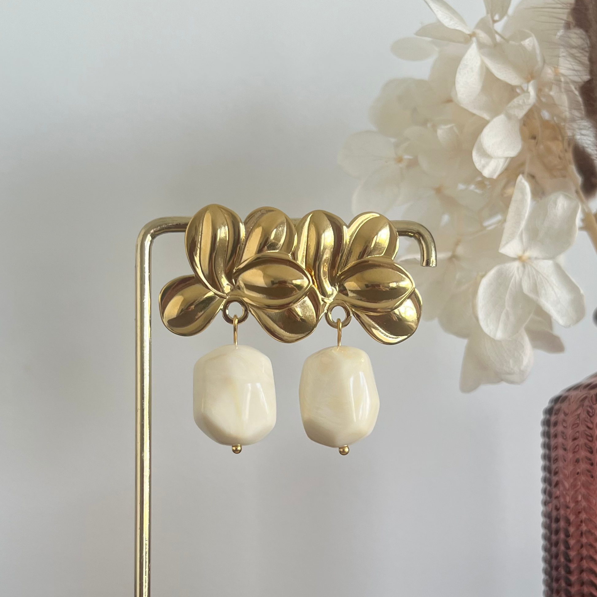 Puces d'oreilles fleurs avec perles baroque irrégulière crème.