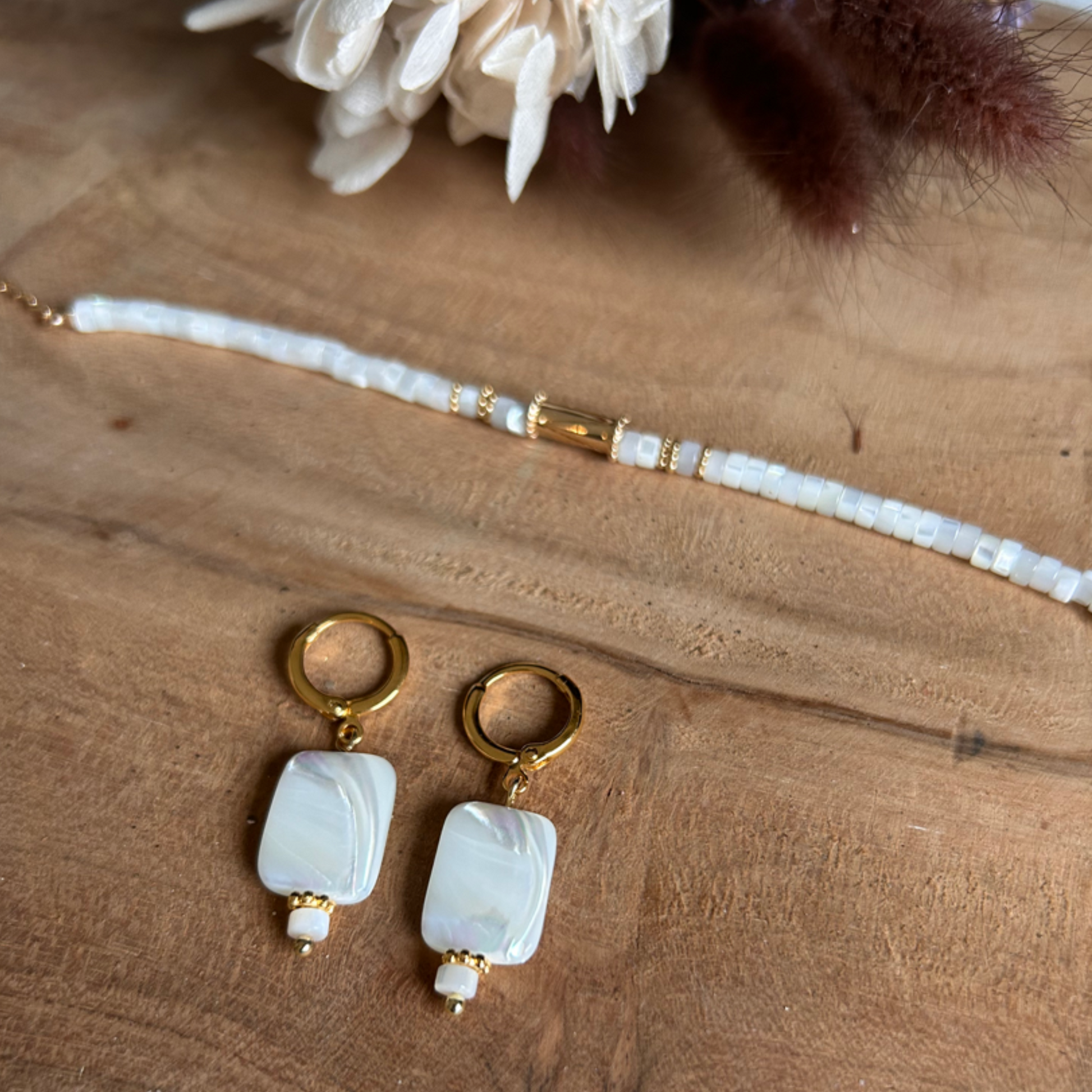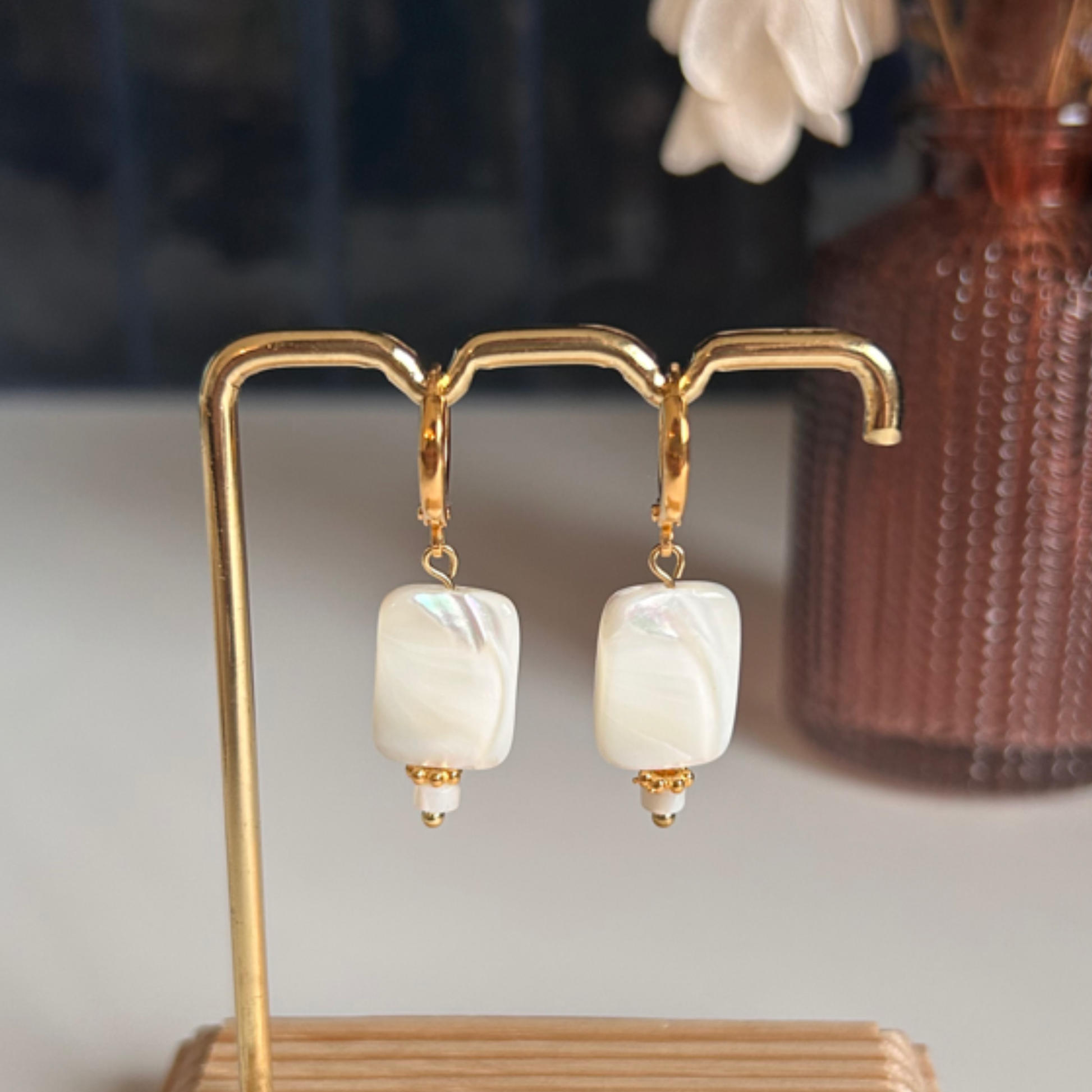 Créoles avec pendentif palet nacre de forme rectangle, perles dorées et nacre.