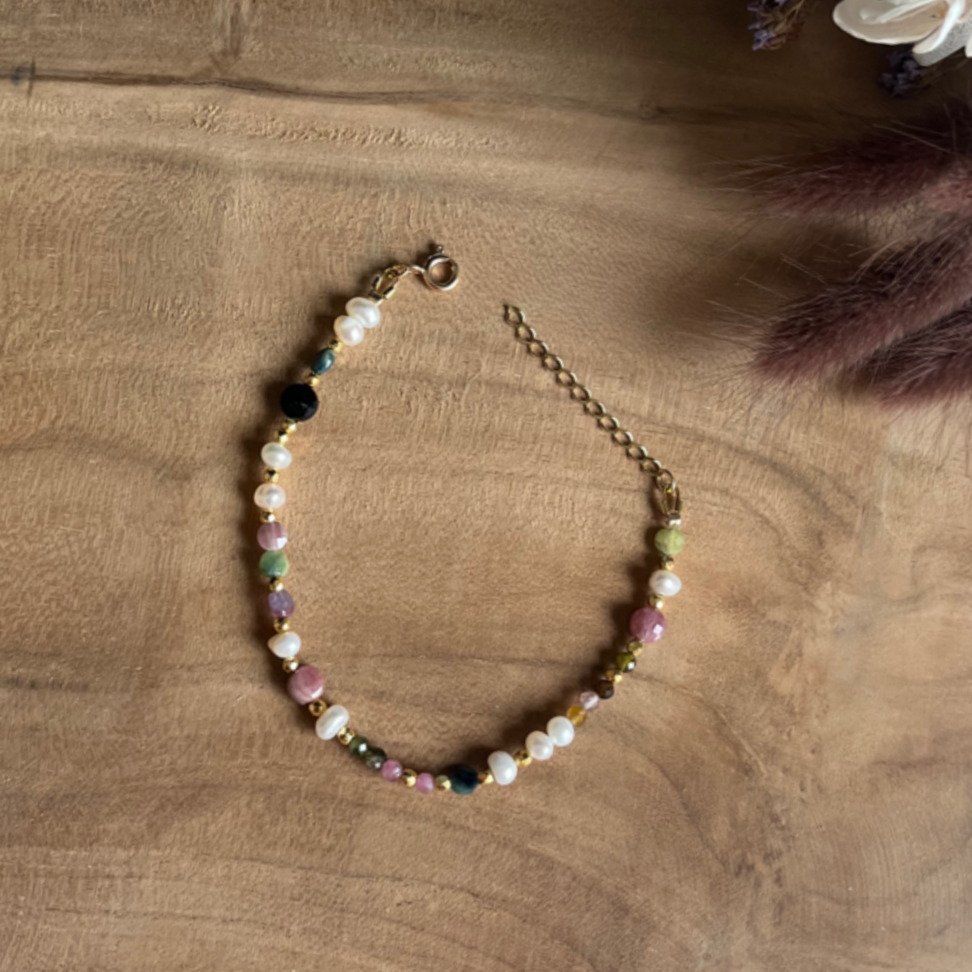 Bracelet de perles dorées, de pierres Tourmaline et de perles d'eau douce.